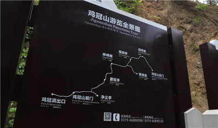 出雞冠洞,左行可登臨雞冠山,海拔1021米,徒步20分鐘可到山頂,山頂涼風習習,遠處可觀縣城城區(qū),往西可望伏牛群山。