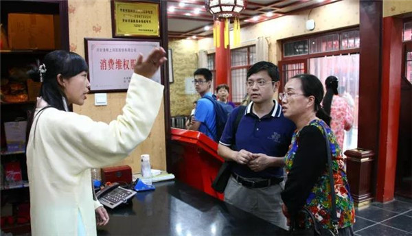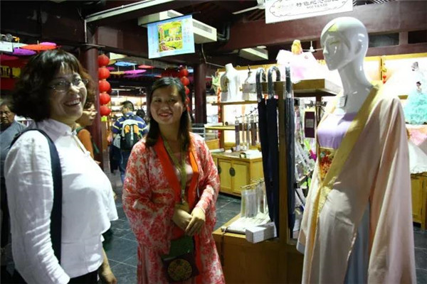 購物中心的姑娘耐心為游客說明商品詳情,贏得游客大大的笑容~