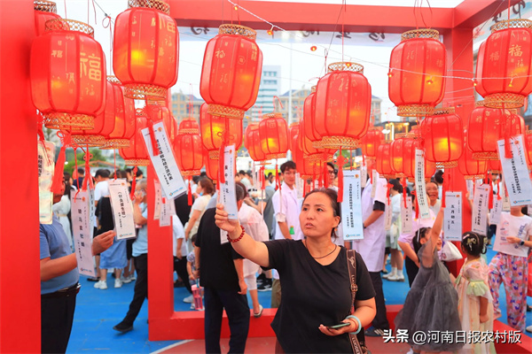 在廣場燈光的輝映下,開封市集現(xiàn)場中央亭子下滿是掛著中醫(yī)藥文化知識謎語的一個個紅燈籠。環(huán)繞現(xiàn)場的是一個個古色古香的攤位,它們攜手有序排開,仿佛一幅精心布置徐徐展開的畫卷。