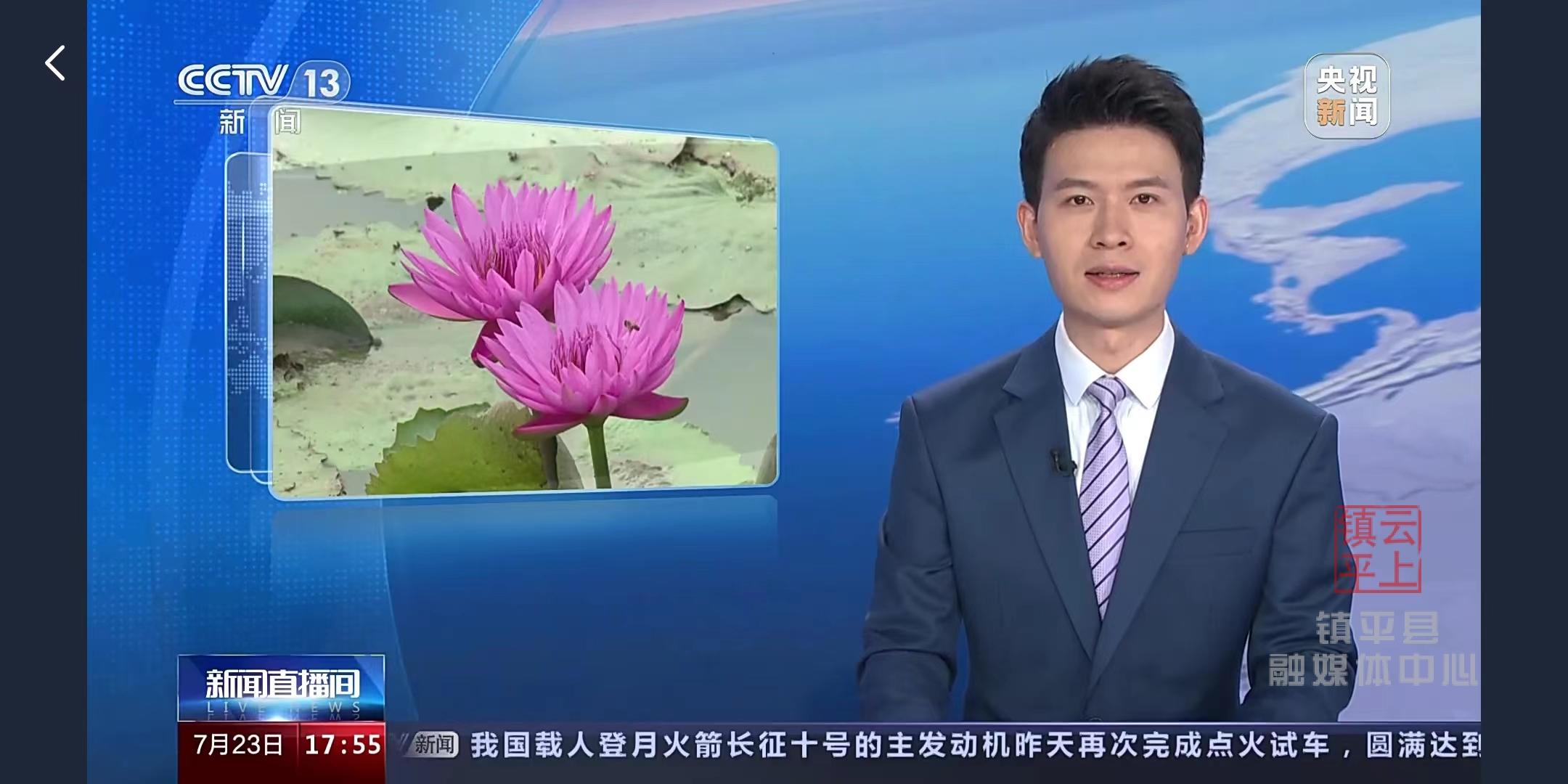 7月23日17:55央視《新聞直播間》以《河南鎮(zhèn)平:夏日荷塘荷蓮爭(zhēng)艷多彩品種競(jìng)相綻放》為題,播出了省市及鎮(zhèn)平縣融媒體中心記者聯(lián)合采編的報(bào)道,時(shí)長(zhǎng)37秒。