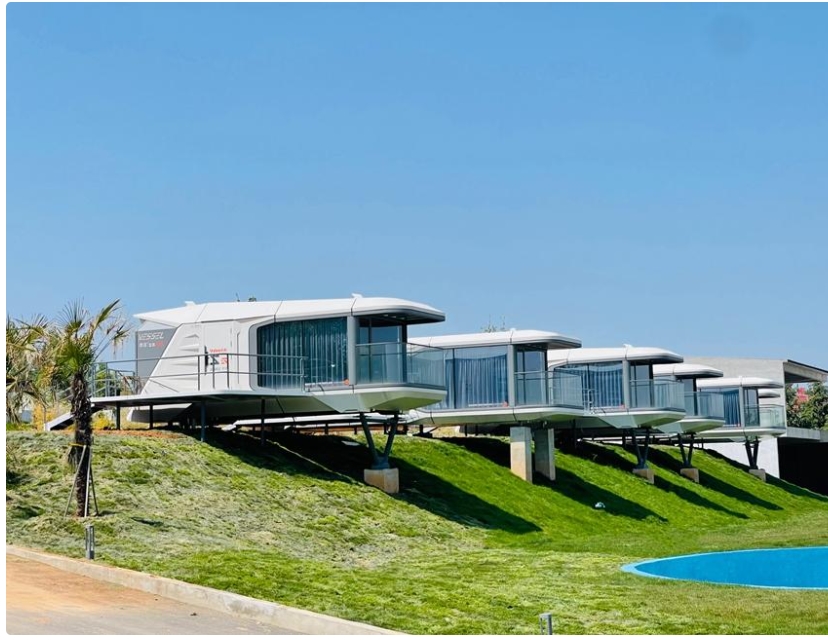 環(huán)顧四周,白墻黛瓦的現(xiàn)代別墅式建筑造型簡潔別致。排排太空艙造型屋舍整齊排列,休閑露臺上,大片翠綠山景映入眼簾,碧空之下,信步山野間的悠然之感縈繞左右。