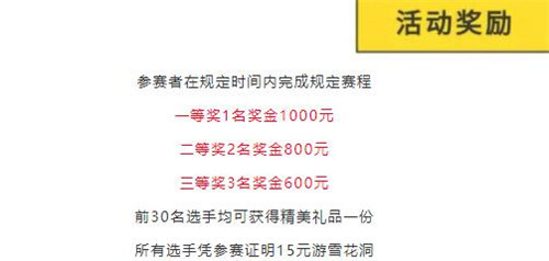 此外,浮戲山雪花洞景區(qū)還為參賽選手奉上現(xiàn)金大獎(jiǎng),參賽者在規(guī)定時(shí)間內(nèi)完成規(guī)定賽程,成績最好的前6名選手分獲一二三等獎(jiǎng)。一等獎(jiǎng)1名獎(jiǎng)金1000元、二等獎(jiǎng)2名獎(jiǎng)金800元、三等獎(jiǎng)3名獎(jiǎng)金600元,同時(shí)前30名選手均可獲得精美禮品一份,所有選手憑參賽證明均可獲得15元暢游雪花洞的福利。