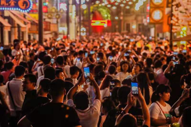 夜游小鎮(zhèn),成為黃金周鄭州東部地區(qū)旅游一大亮點(diǎn)。夜幕降臨,隨著電影大道霓虹燈亮起,熱鬧繁華的百年德化,今時(shí)重現(xiàn)。電影小鎮(zhèn)藝術(shù)團(tuán)的夜間精彩表演,吸引大量游客專門驅(qū)車趕夜場(chǎng)。不僅僅是看藝術(shù)團(tuán)的演出,琳瑯滿目的非物質(zhì)文化遺產(chǎn)展演,也吸引著游客駐足?匆粓(chǎng)大鼓書、雜技,聽(tīng)一段噴空、三弦,感受一下拉洋片、皮影戲,電影小鎮(zhèn)夜游彌漫著濃濃的文化氣息。