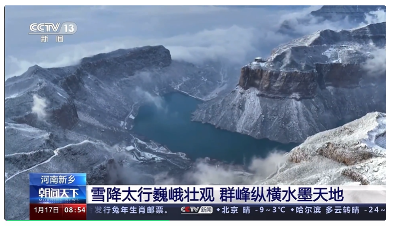 春節(jié)臨近,潔白的瑞雪給大地換上銀裝,太行群峰雪后壯麗景觀盡收眼底!在1月17日央視13套《朝聞天下》,以【雪降太行巍峨壯觀,群峰縱橫水墨天地】對雪后水墨般寶泉美景進行報道。