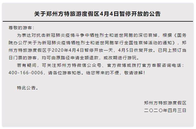 根據(jù)《國務(wù)院辦公廳關(guān)于為新冠肺炎疫情犧牲烈士和逝世同胞舉行全國性哀悼活動的通知》,為表達對抗擊新冠肺炎疫情斗爭犧牲烈士和逝世同胞的深切哀悼,鄭州方特旅游度假區(qū)于2020年4月4日閉園一天,暫停對外開放,4月5日恢復(fù)營業(yè)。請游客提前做好安排。