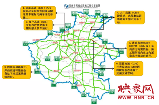 (6) 連霍高速 (G30) 蘭考段439公里+30米-482公里+100米東向西因跨隴海橋改擴(kuò)建施工,從7月13日進(jìn)行交通管制,管制時(shí)間到2019年4月30日。繞行路線:連霍高速與鄭民高速互通立交,往鄭州、霍爾果斯方向的車輛,請(qǐng)繞行鄭民高速;連霍高速與商登高速互通立交,往鄭州、霍爾果斯方向的車輛,請(qǐng)繞行商登高速。