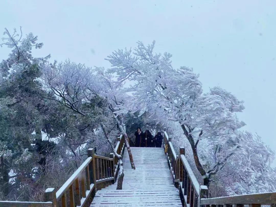 積雪點(diǎn)綴的群峰,山舞銀蛇,茫茫林海更顯巍峨壯觀。游道被積雪覆蓋,猶如白色地毯向森林深處延伸。