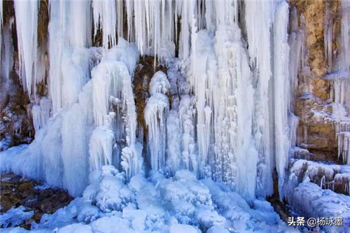 在懸崖峭壁旁,流水被時間和溫度的施法下,停留在此,一排排晶瑩剔透的冰柱,好似刀鋒倒插在山壁上,在陽光的照耀下,耀武揚威著。