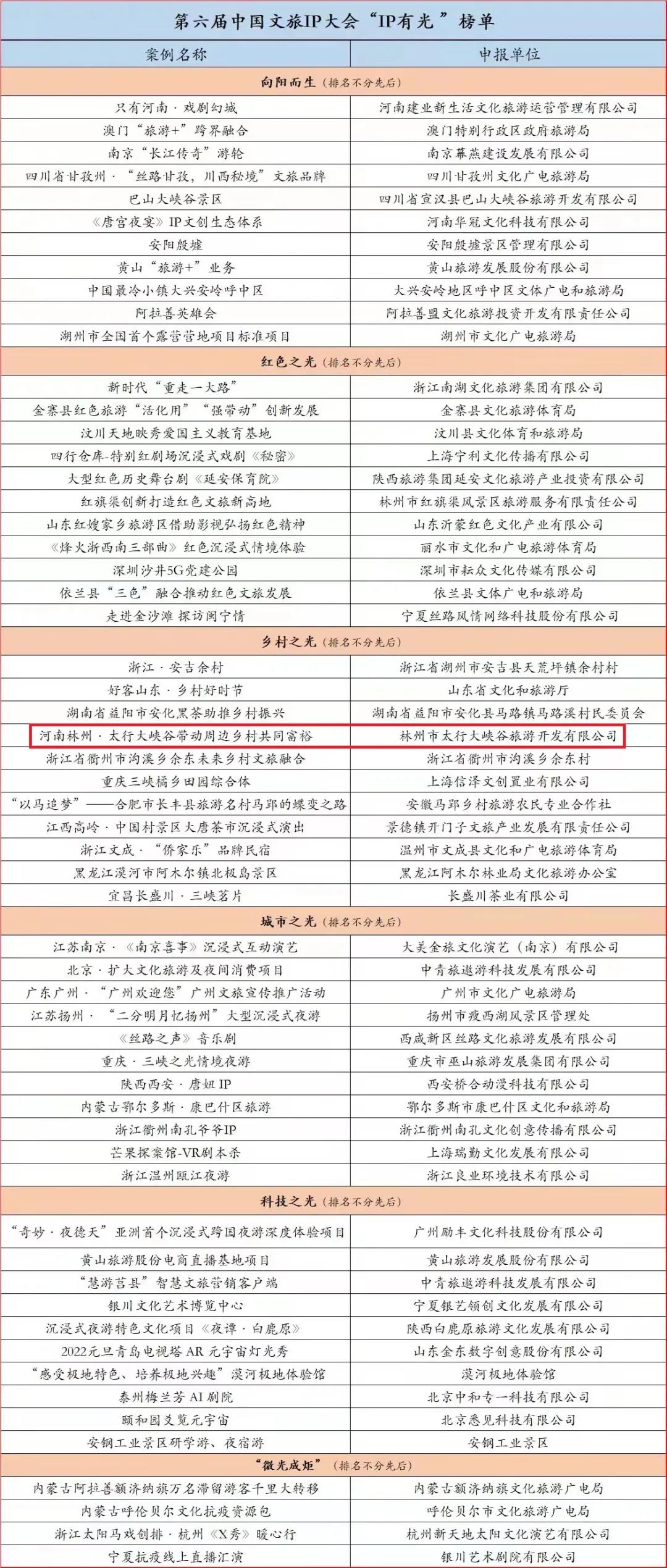 1月22日,由中國旅游研究院學(xué)術(shù)指導(dǎo),奇創(chuàng)旅游集團(tuán)、景域驢媽媽集團(tuán)主辦的“第六屆中國文旅IP大會”在線舉行。林州太行大峽谷景區(qū)榮登“鄉(xiāng)村之光”榜單。