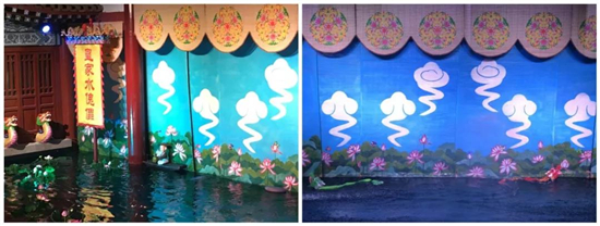 人們看到的戲房,似一座彩樓的樣子,建在戲臺(tái)的后部水中,呈上下層重疊式,從外表看,戲房前面用三大片竹簾為幕,可供水木偶進(jìn)出,同時(shí)也是隔向觀眾與演員的一堵墻,“墻”后的藝人和動(dòng)作,觀眾則看不到。水傀儡藝術(shù),意在制造先聲奪人的氣氛,非常注重視角感觀的藝術(shù)效果。