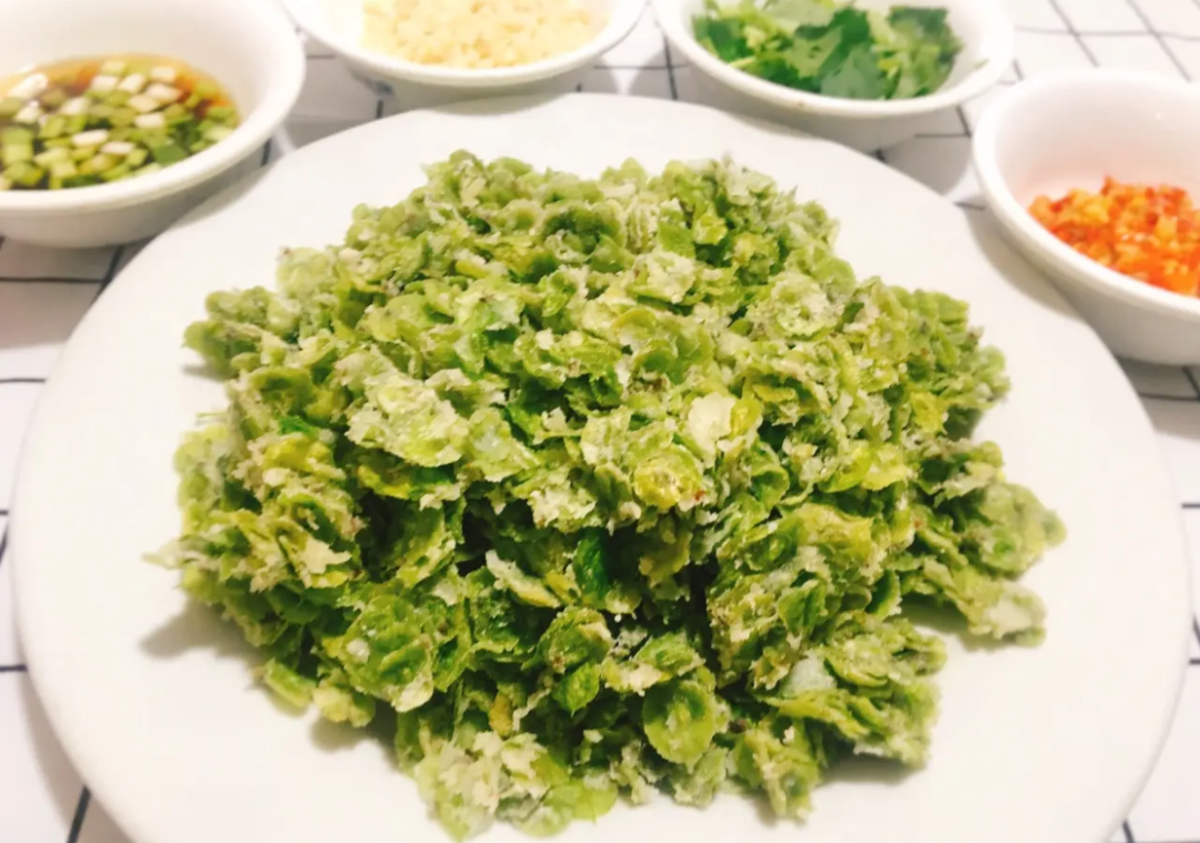 欒川人愛吃的野菜真的很多,茵陳算是極其有特色的!清熱利濕的茵陳幾乎人人都愛~茵陳也叫白蒿,做法簡單,裹上點面,籠蒸就行了!茵陳香甜可口,配上蒜汁就更美味了!