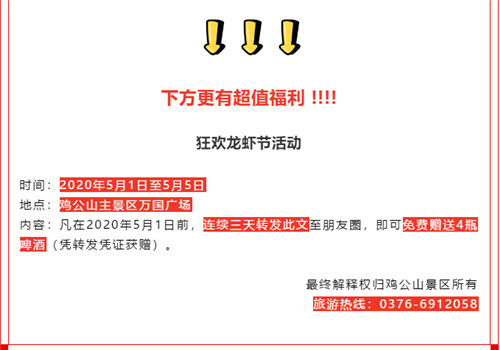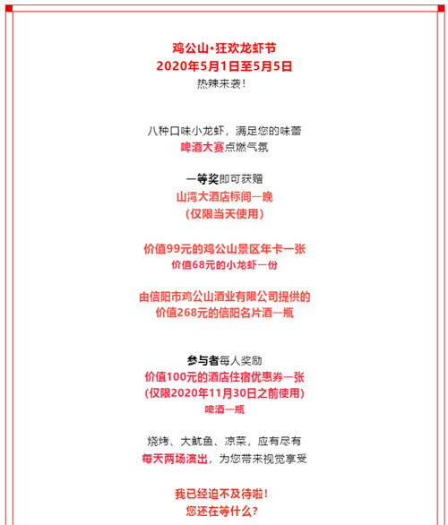 一等獎即可獲贈山灣大酒店標間一晚(僅限當天使用)價值99元的雞公山景區(qū)年卡一張價值68元的小龍蝦一份