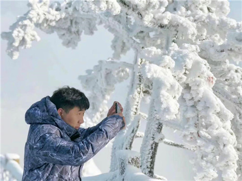 澄藍(lán)凈透的天空下,陽光照射著雪海茫茫,伴隨著霧氣蒸騰,猶如海外仙山。漫步山野之間隨處可見的玉樹瓊花,讓人在云巔仙境之中流連忘返。這如童話般的美景吸引了前來賞雪游玩的游客紛紛拿出相機(jī),定格白云山這夢(mèng)幻的雪后美景。