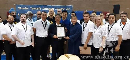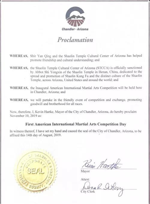 11月10日,美國(guó)亞利桑那州少林文化中心在負(fù)責(zé)人釋延傾的策劃組織下,圓滿舉辦“亞利桑那州首屆美國(guó)武術(shù)錦標(biāo)賽”。賽事當(dāng)天,有來(lái)自美國(guó)六個(gè)州的近200人參加比賽,近600人現(xiàn)場(chǎng)觀摩。市議員Sam Huang 先生、華人華僑聯(lián)合會(huì)會(huì)長(zhǎng)Jerry Dai先生等嘉賓出席了開幕式,他們一致表示,這是一次非常好的中國(guó)文化傳播交流活動(dòng),一定能促進(jìn)中美兩國(guó)文化之間的交流。Sam Huang先生還當(dāng)場(chǎng)宣讀了市長(zhǎng)的賀信。
