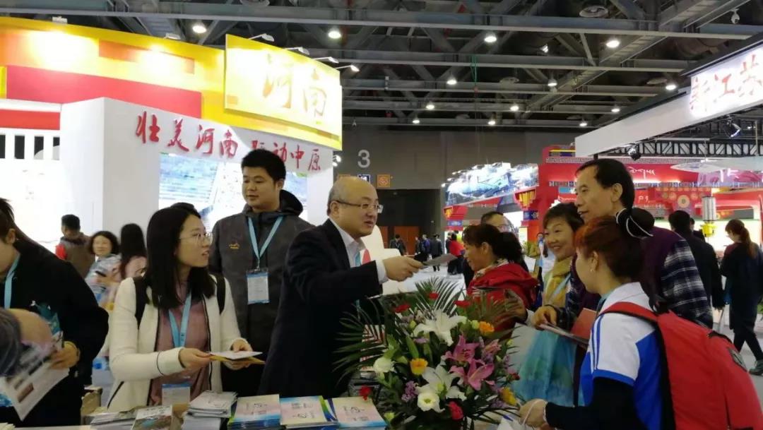 焦作市旅游局工作人員在博覽會(huì)上發(fā)放焦作體育旅游宣傳資料