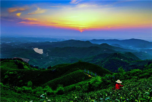 遙望茶山云霧繞,茶香醉心人神往,若隱若現(xiàn)采茶者,茶山如歌入夢來。