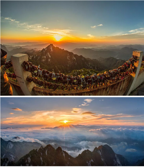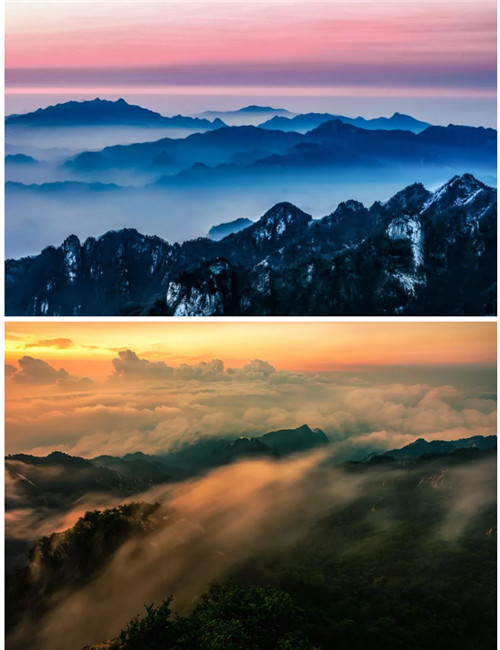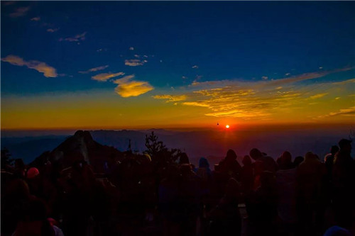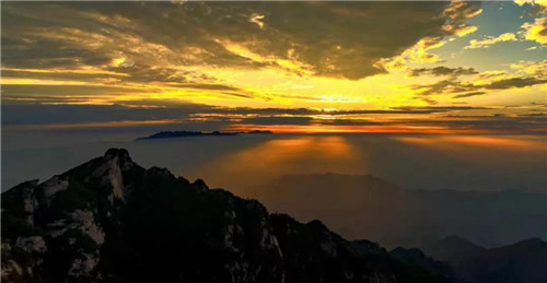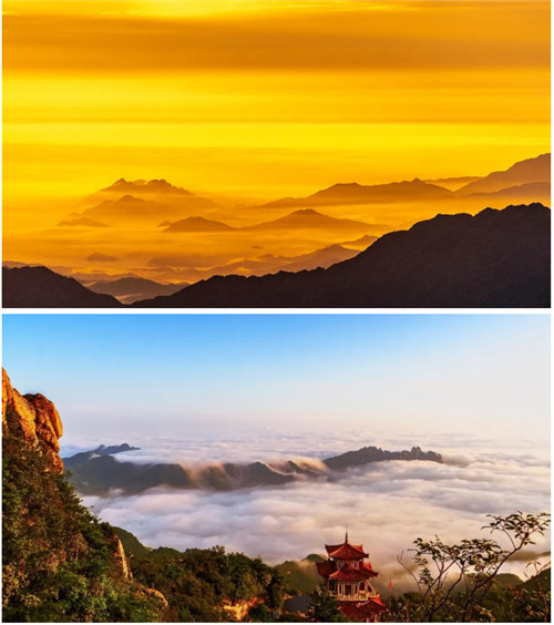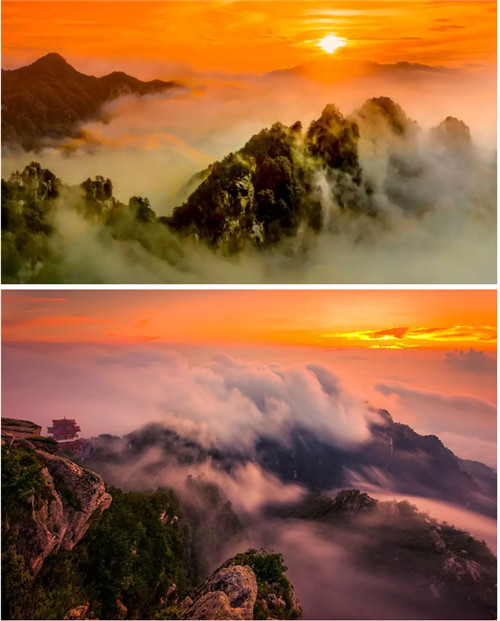 彩云下,空曠的紫藍色天幕上,剎那間一抹光點亮沉寂的天空,一輪紅日緩慢升起,逐漸變成弧形、半圓,變成桔紅、金紅,然后自云海中跳出來,散發(fā)出強烈的光芒,那一刻朝霞滿天,萬道金光與大地、云海、金殿交相輝映,白云山也變成了真正的云海仙山。