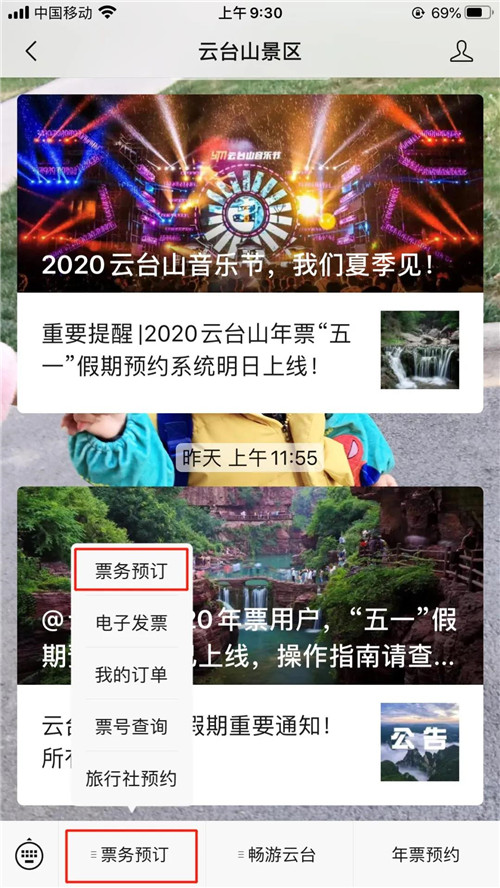 云臺(tái)山景區(qū)公眾號(hào),點(diǎn)擊菜單欄“票務(wù)預(yù)訂”;