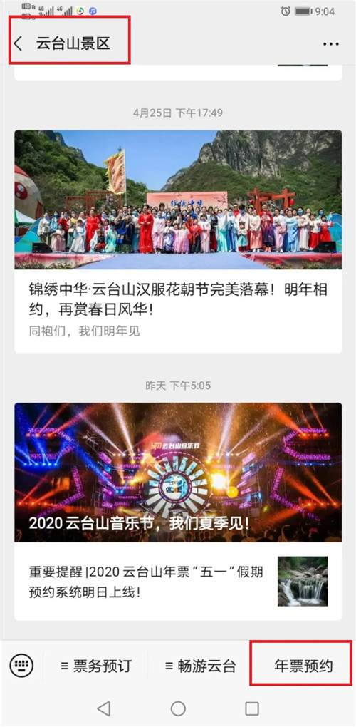 第一步:關(guān)注云臺(tái)山景區(qū)公眾號(hào),點(diǎn)擊菜單欄“年票預(yù)約”