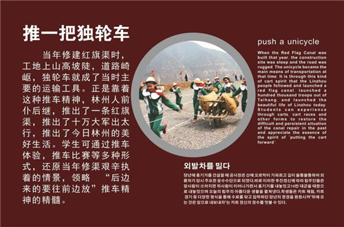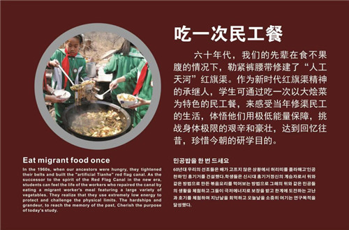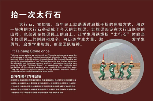 實訓(xùn)基地場地設(shè)置有就餐區(qū)、體驗區(qū)、休息區(qū)、衛(wèi)生區(qū)。按照研學(xué)要求,紅旗渠景區(qū)推出了十個一精品課程,其中推一把獨輪車、掄一回開山錘、抬一次太行石、吃一次民工餐就在實訓(xùn)基地開展。通過這些體驗活動,還原當(dāng)年修渠時戰(zhàn)天斗地的情景,讓學(xué)生感受當(dāng)年修渠民工的剛毅和艱辛?杉ぐl(fā)學(xué)生勇氣,啟發(fā)學(xué)生智慧,讓青少年在創(chuàng)作中獲得快樂。