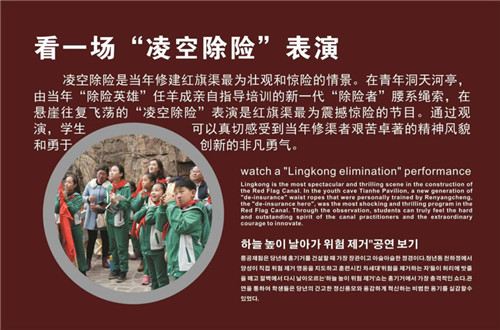 觀看實景演出《又見紅旗渠》,通過 “缺水”“盼水” “引水”“通水”的場景演繹,以及再現(xiàn)掄錘打釬,凌空除險等工作方式,讓學(xué)生在觀看的過程中穿越歷史,回到那個激情燃燒的修渠歲月。