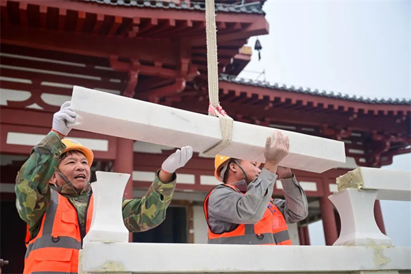 日前,在老城區(qū)翠云閣項目建設(shè)現(xiàn)場,工人正在安裝石材欄桿。