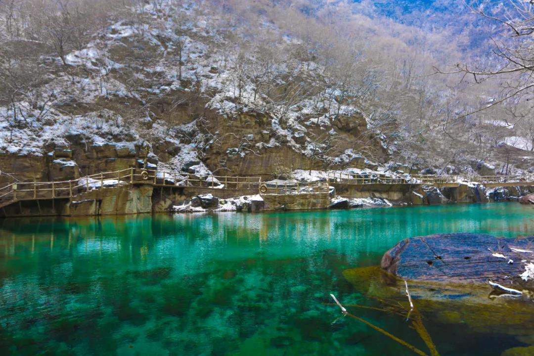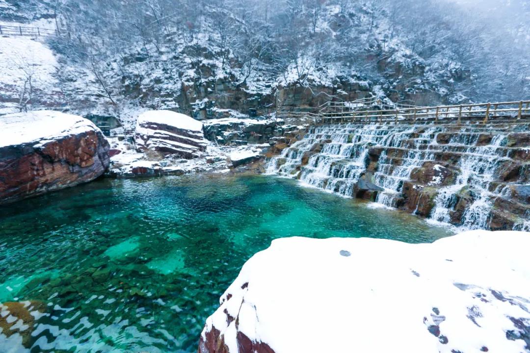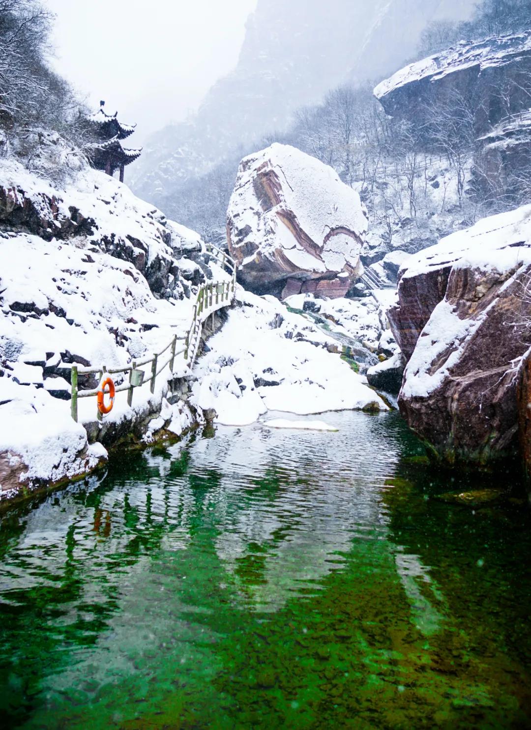 水繞山,山負(fù)雪,雪映人,讓靈魂沐浴在雪的圣潔之間得到洗滌。塵世的忙碌與喧囂,似乎都離你而去,剩下的唯有純凈二字。雪意闌珊中,心靈開(kāi)出一朵禪意的花。