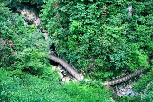 這里集豫皖自然風(fēng)光的秀美與驚奇于一體,漫步于景觀步道之上,醉心于茂林修竹之間,水車、石屋、大壩、瀑布生動呈現(xiàn)著一步一景。進(jìn)入攀巖步道后立感驚險(xiǎn)刺激,步道架設(shè)在峭壁之間,涓涓溪流從身邊流過。最后到達(dá)雨潭大瀑布,潭水飛流直下,蔚為壯觀。