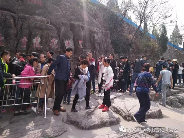 在清明節(jié)小長(zhǎng)假期間,浮戲山雪花洞景區(qū)迎來(lái)了這一時(shí)段的旅游高峰,四面八方的游客慕名而來(lái),景區(qū)內(nèi)格外熱鬧非凡,游客隨處可見(jiàn);蛞患胰冢蚺笥咽嗳,還有組團(tuán)前來(lái)的,一派旅游節(jié)日的繁榮景象。
