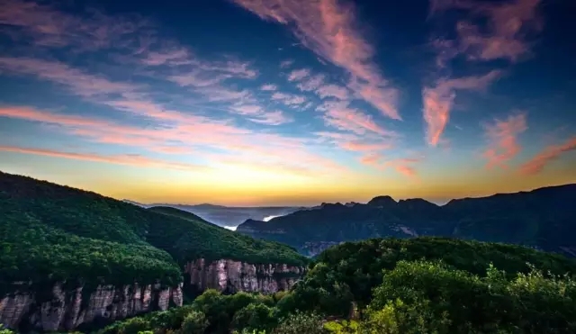 金色的陽(yáng)光垂照,橙黃的光芒橫亙成一道耀眼異常的天際線,天空璀璨旖旎,云霞翻涌,眼前山谷靜謐幽深,山林亭亭如蓋,奔涌的大河,此刻在山巒峽谷的遮擋下,只得見淺淺的一灣,好似漂浮的游龍。