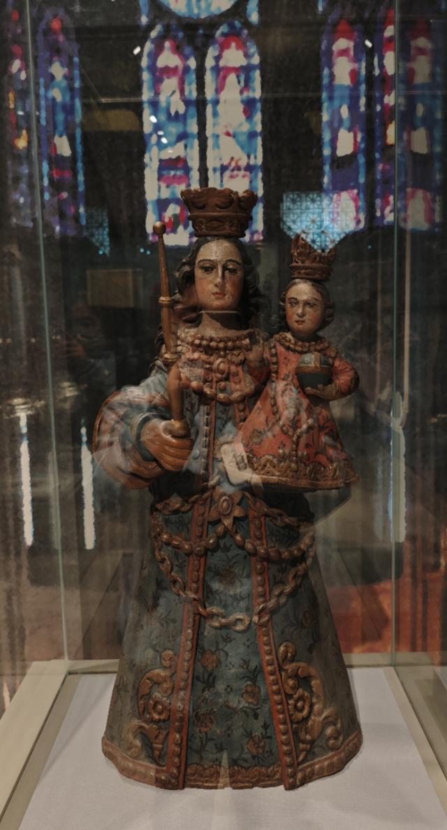 另一件展品是圣母瑪利亞雕像,面容端莊,神態(tài)安詳,她一手拿著權(quán)杖,這是權(quán)力和尊嚴(yán)的象征,一手托著嬰兒耶穌,給人一種慈愛和保護(hù)的感覺,嬰兒耶穌的右手指向天空,象征著祝福和救贖。