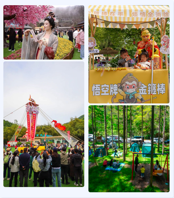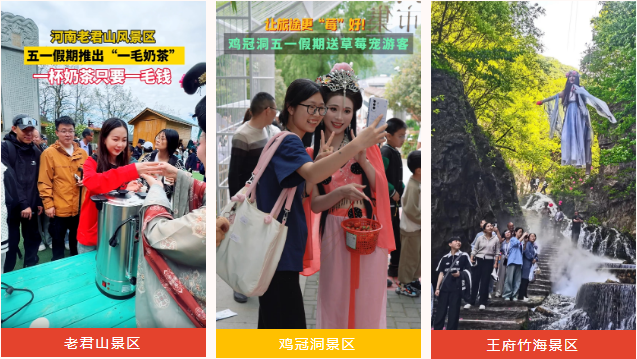 “五一”假期,非遺、漢服、露營(yíng)、演藝、美食等新文旅產(chǎn)品備受游客歡迎。老君山景區(qū)仙山花海節(jié)中,游客與漢服NPC互動(dòng)跳舞,承接月老祝福;雞冠洞景區(qū)“奇幻相遇·神都英雄匯 ”上游客與“狄仁杰”“魯智深”“花木蘭”互動(dòng)玩游戲,共同完成穿越之旅。重渡溝景區(qū)非遺百戲連接白天與夜晚,游客親身體驗(yàn)非遺的魅力。龍峪灣景區(qū)“云頂帳篷節(jié)”帶來一場(chǎng)2222.5米山頂浪漫,站在伏牛之巔邂逅浩渺星空。