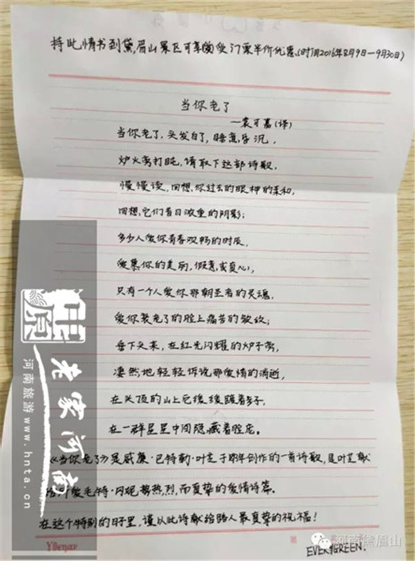 無論你是在洛陽,還是鄭州,只要現(xiàn)場(chǎng)收到我們黛眉山送出的情書,持此情書到黛眉山景區(qū)可享受門票折扣價(jià)優(yōu)惠(時(shí)間2016年8月9日-9月30日)。