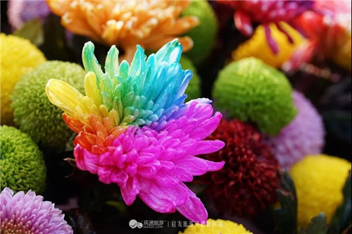 不少游客以為七彩炫菊是染色的菊花,其實不然,偶有幾個伸手去摸的游客也沒有摸到滿手的顏料。雖然七彩炫菊的每朵花都色彩斑瀾,但它的養(yǎng)成并沒有多么神秘,七彩炫菊是通過生物技術(shù)把藥水或者生物科技放進(jìn)花根莖里邊,菊花吸收了藥水的養(yǎng)分,便有了多彩惹人愛的模樣。