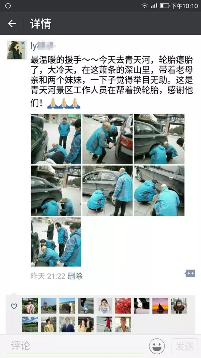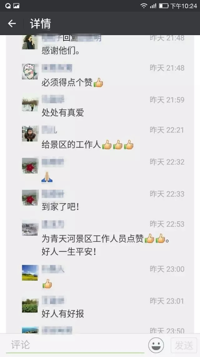 這一暖心舉動(dòng)被細(xì)心的劉女士用手機(jī)拍了下來,并發(fā)送到自己的微信朋友圈上,短時(shí)間內(nèi)獲得了眾多好友的點(diǎn)贊和好評(píng),紛紛為青天河景區(qū)工作人員的暖心服務(wù)點(diǎn)贊。