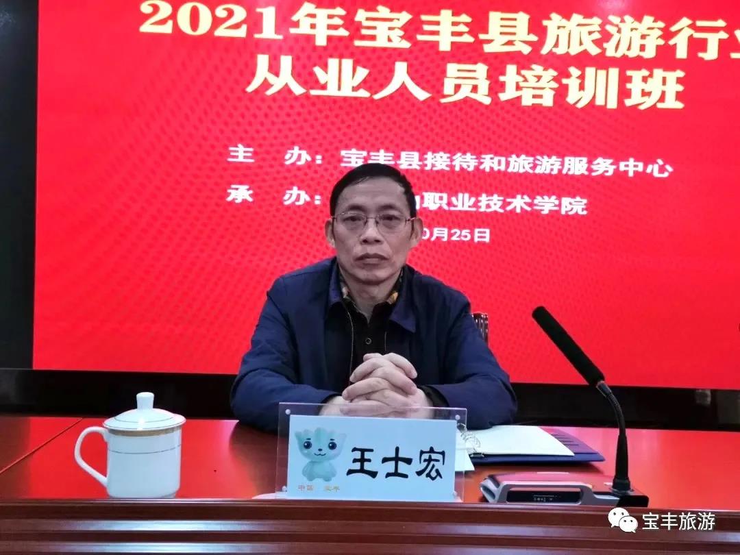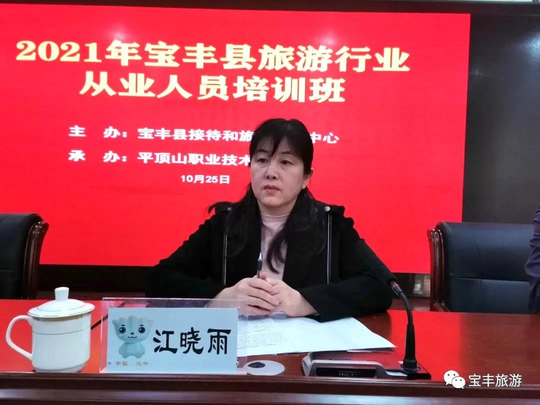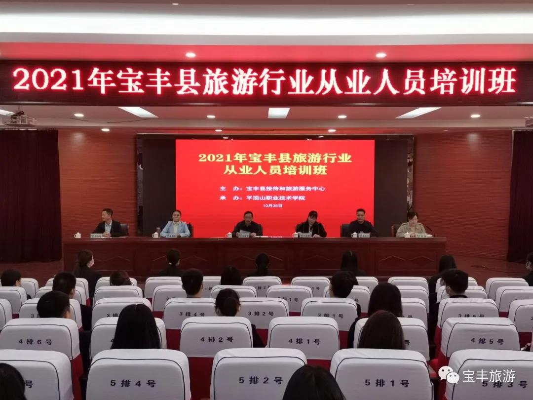 10月25日,2021年寶豐縣旅游行業(yè)從業(yè)人員培訓(xùn)班開班儀式在平頂山職業(yè)技術(shù)學(xué)院舉行。平頂山職業(yè)技術(shù)學(xué)院培訓(xùn)中心主任王士宏,平頂山職業(yè)技術(shù)學(xué)院旅游與酒店管理系主任王新亞,寶豐縣政府辦公室副主任江曉雨,寶豐縣接待和旅游服務(wù)中心黨組書記、主任王校杰等出席開班儀式。