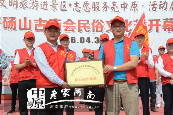 省旅游局局直團(tuán)委書記高翔向芒碭山旅游區(qū)授予“河南省旅游志愿者服務(wù)基地”銅牌