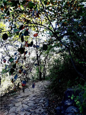 石徑蜿蜒通幽處,斜陽穿葉麗影倩。
