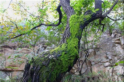 峰高谷深云縹緲,老樹古藤披翠蘚。