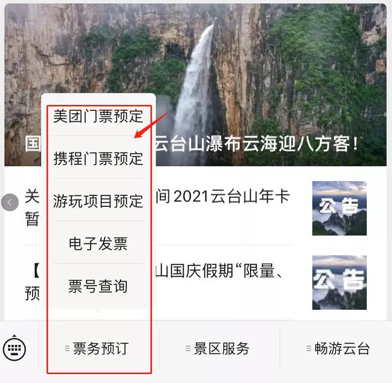 “云臺(tái)山景區(qū)”官方微信公眾號(hào),預(yù)約票務(wù),輕松入園。
