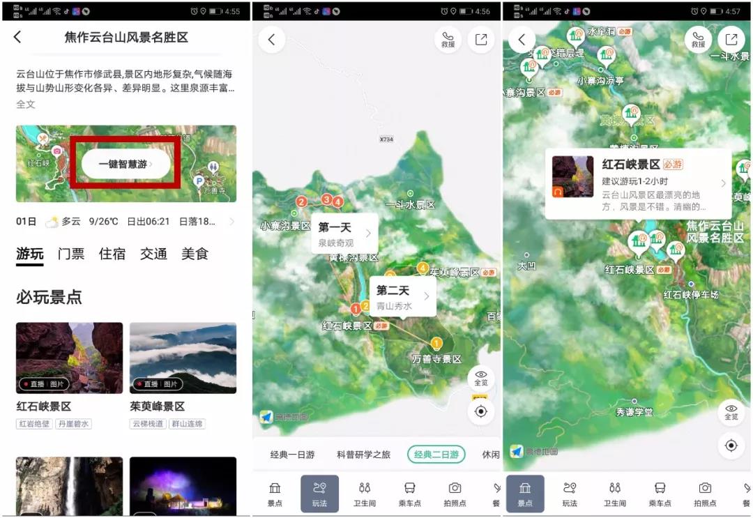 打開(kāi)高德地圖APP搜索云臺(tái)山“一鍵智慧游”,線(xiàn)路玩法、景點(diǎn)推薦,各項(xiàng)需求輕松到位。