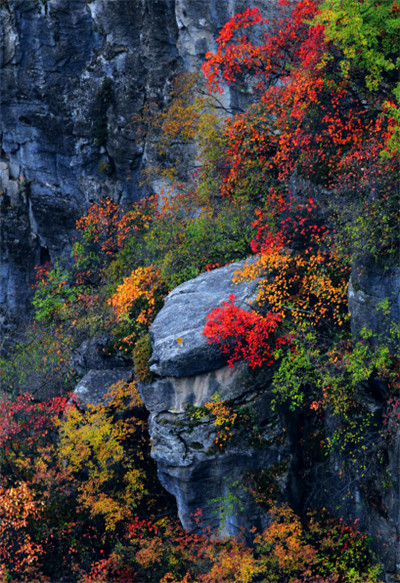 叢山迭嶂,絕壁斷崖,夏天里被郁郁叢林遮掩住的山崖漸漸的裸露出了全貌,赤色的斷崖,陽剛勁露,在色彩斑斕的秋葉映襯下也增添了一絲溫柔與柔美。
