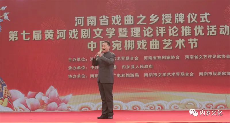 2月16日,由河南省文聯(lián)、河南省戲劇家協(xié)會(huì)、河南省文藝評(píng)論家協(xié)會(huì)主辦,中共內(nèi)鄉(xiāng)縣委、內(nèi)鄉(xiāng)縣人民政府承辦,南陽(yáng)市文化廣電和旅游局、南陽(yáng)市文聯(lián)、南陽(yáng)市戲劇家協(xié)會(huì)協(xié)辦的“河南省戲曲之鄉(xiāng)”授牌儀式暨中國(guó)宛梆戲曲藝術(shù)節(jié)在內(nèi)鄉(xiāng)縣衙廣場(chǎng)隆重舉行,同時(shí)舉辦“第七屆黃河戲劇文學(xué)暨理論評(píng)論推優(yōu)活動(dòng)頒獎(jiǎng)典禮”