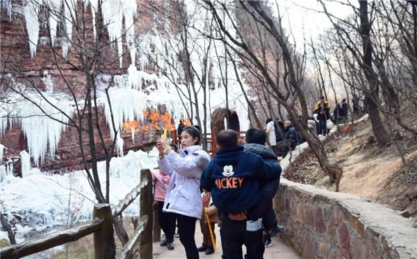 九峰山景區(qū)情侶谷冰掛景觀升級,入口增設峭壁冰掛畫廊,引來眾多游客拍照打卡。