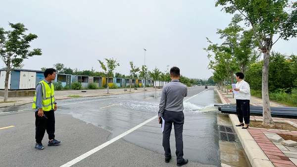 隨著降雨再度增強(qiáng),同心湖達(dá)到湖面設(shè)計(jì)警戒水位,華盛軒有湖水倒灌風(fēng)險。防汛隊(duì)員立即行動,運(yùn)輸堆放大量沙袋到指定地點(diǎn),對出入口水流進(jìn)行封堵、引導(dǎo),借助龍吸水和大流量排污車進(jìn)行強(qiáng)排作業(yè),經(jīng)各小組緊密協(xié)作,同心湖水位持續(xù)下降到安全水位以下,演練圓滿結(jié)束。