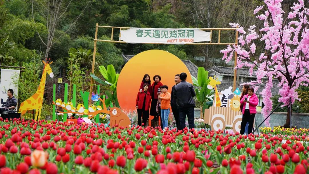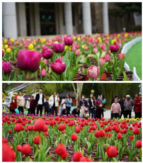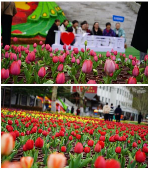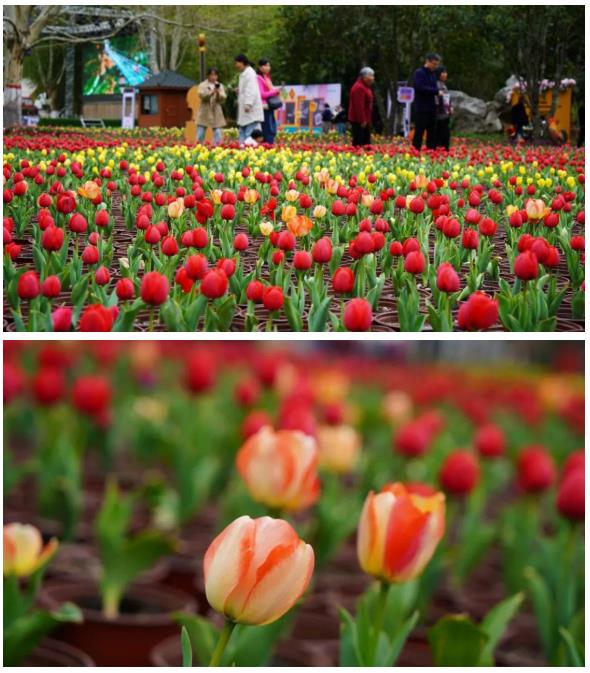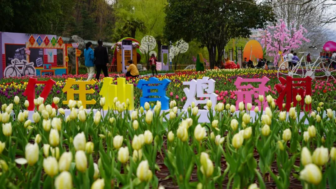雞冠洞景區(qū)30余萬株郁金香通過不同的創(chuàng)意搭配,營造美輪美奐的“花溪”、“花境”、“花田”、“花園”場景,用色彩與夢幻的交織,書寫詩意盎然的春天。