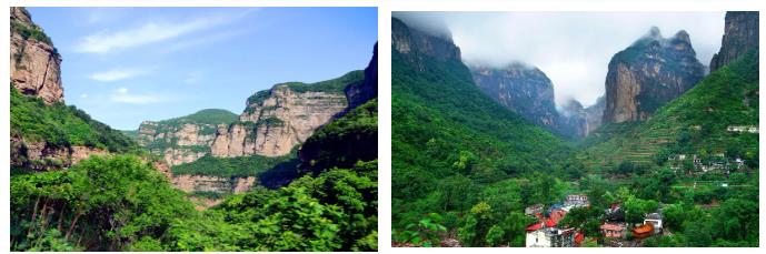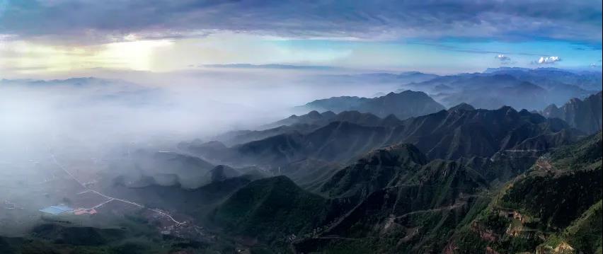 是太行大峽谷的顏色,淡雅清爽,翠綠的山谷與天空,純粹的藍(lán)相互輝映,好一幅意境悠遠(yuǎn)的絕色山景圖。