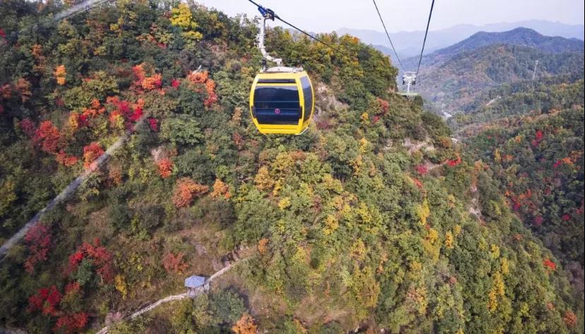 乘坐重渡溝索道向外望,紅綠相間的是黃楝,紅彤彤的是黃櫨,紅中有黃的是柿樹,一簇簇火一樣紅葉鑲嵌在叢林間,就像是一幅人工潑墨畫。