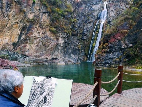 秋韻靈動,山水入畫,太行寶泉的雄奇峻險飛瀑流泉躍然紙上,藝術大師描繪出“醉美”寶泉。