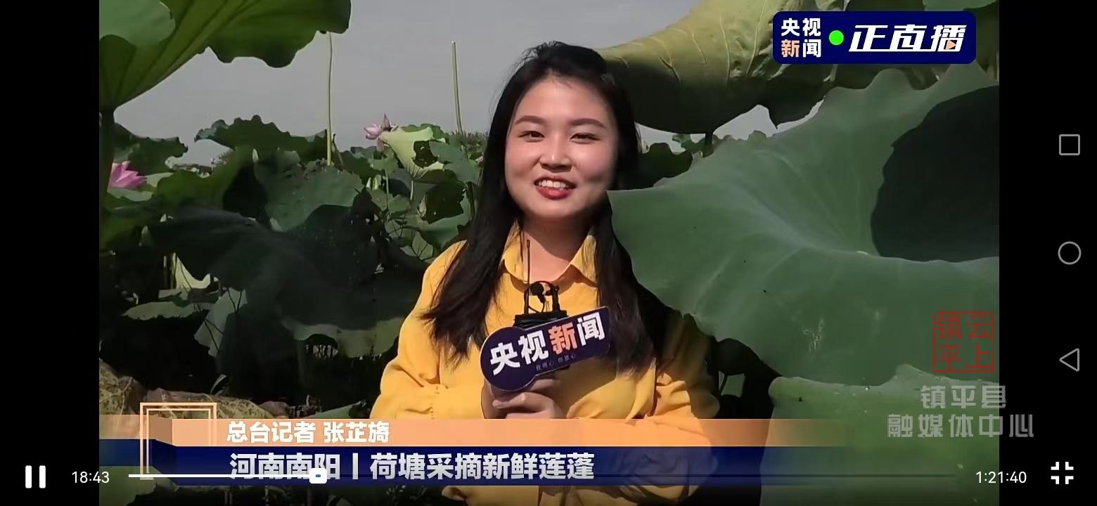 央視總臺(tái)記者張芷旖:“央視新聞的網(wǎng)友們大家好,我是總臺(tái)記者張芷旖,今天的荷花直播第一站啊,我們來到了位于河南省南陽市鎮(zhèn)平縣的中原荷花博覽園.....”